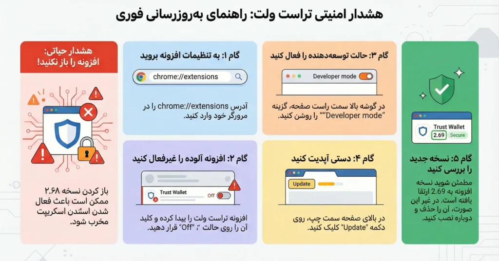اگر شما از افزونه مرورگر تراست ولت استفاده می‌کنید، باید فوراً اقدامات زیر را انجام دهید. حتی اگر دارایی شما هنوز سرقت نشده است، ماندن روی نسخه ۲.۶۸ مانند نشستن روی بمب ساعتی است.