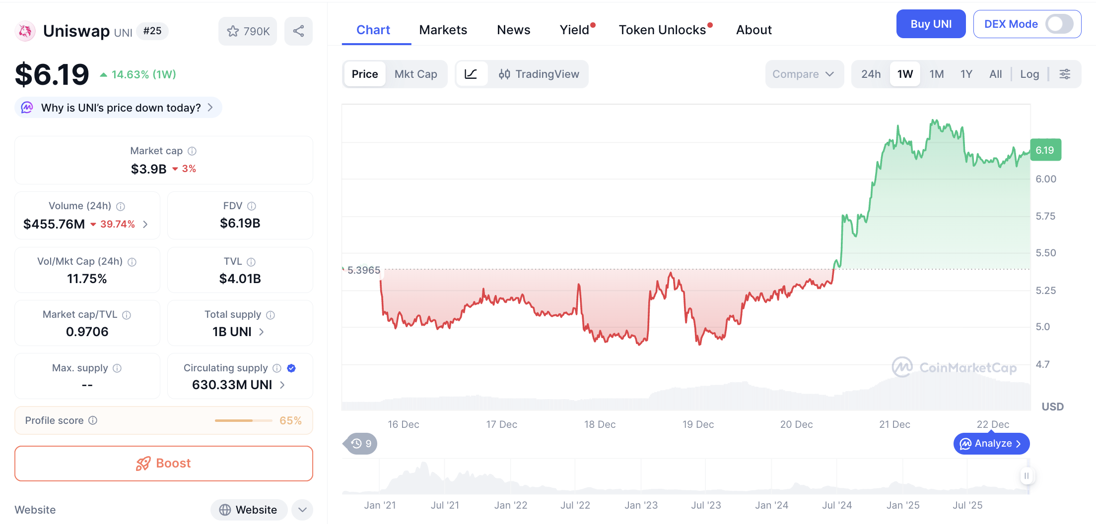 بازار نیز پیشاپیش واکنش مثبتی به این تحولات نشان داده است. از زمان آغاز رأیگیری یونیفیکیشن، قیمت یونیسواپ حدود ۲۵٪ رشد کرده و در حال حاضر حوالی ۶.۱۹ دلار معامله میشود. این رشد، پایاندهنده دورهای از ضعف قیمتی بود که طی آن، توکن UNI در جریان اصلاح کلی بازار، تا کف هفتماهه ۴.۸۸ دلار سقوط کرد.