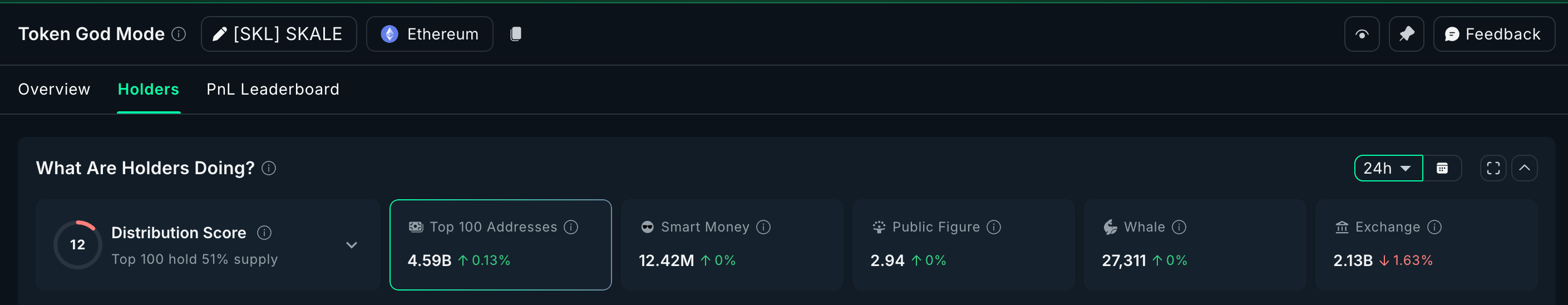 دادههای پلتفرم نانسن نیز نشان میدهد که ۱۰۰ آدرس برتر شبکه اسکیل، در مجموع ۰.۱۳٪ یعنی ۶ میلیون توکن به داراییهای خود افزودهاند که با قیمت کنونی به معنای خرید ۱۲۶ هزار دلار توکن در یک روز است که از انباشت آرام و هدفمند سرمایهگذاران خبر میدهد.