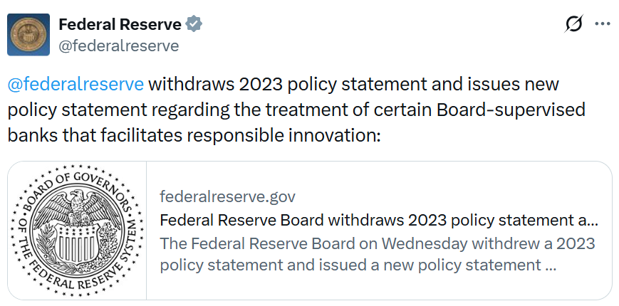فدرال رزرو (Federal Reserve) آمریکا اعلام کرد که راهنمای صادرشده در سال ۲۰۲۳ درباره تعامل بانکهای تحت نظارت خود با حوزه ارزهای دیجیتال را لغو کرده است.