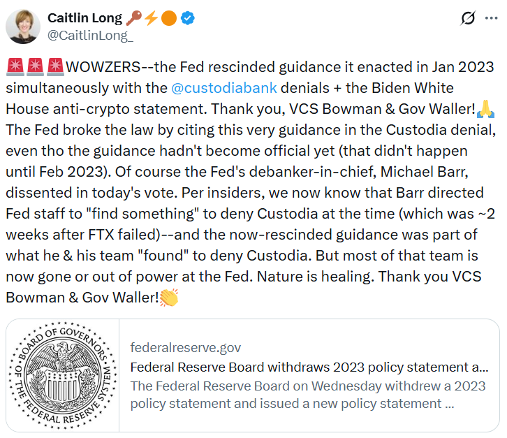 کیتلین لانگ (Caitlin Long)، مدیرعامل بانک کریپتومحور کاستودیا بانک (Custodia Bank)، در واکنش به این خبر در شبکه اجتماعی ایکس نوشت که همین راهنمای سال ۲۰۲۳ یکی از دلایل اصلی رد درخواست بانک او برای دریافت حساب مستر بوده است.