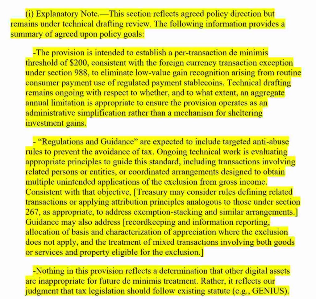 بر اساس این پیشنهاد، کاربران برای تراکنشهای استیبل کوینی تا سقف ۲۰۰ دلار ملزم به شناسایی سود یا زیان نخواهند بود؛ مشروط بر اینکه استیبل کوین مورد استفاده توسط یک ناشر مجاز طبق قانون جینیس (GENIUS Act) صادر شده باشد، به دلار آمریکا متصل باشد و در عمل، نوسان قیمتی بسیار محدودی در حوالی ۱ دلار داشته باشد.