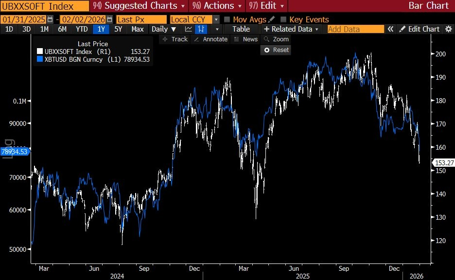 قیمت بیت کوین (BTC) و سهام SaaS اخیراً هم‌راستا حرکت کرده‌اند و هر دو به‌طور قابل توجهی کاهش یافته‌اند. این موضوع قابل توجه است، زیرا هر دو «دارایی‌های بلندمدت» محسوب می‌شوند؛ یعنی ارزش آن‌ها به‌شدت بر اساس جریان‌های نقدی آینده و میزان پذیرش فناوری در آینده تعیین می‌شود و بنابراین به شرایط نقدینگی و نرخ بهره بسیار حساس هستند.