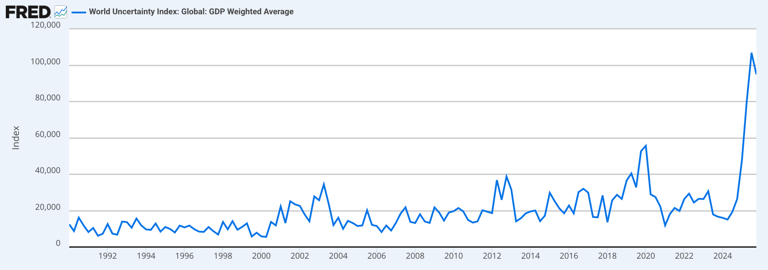 شاخص نااطمینانی جهانی (World Uncertainty Index)، که احساسات سرمایه‌گذاران را رصد می‌کند، در سال ۲۰۲۵ میلادی (۱۴۰۴ شمسی) به سقف‌های تاریخی خود رسیده است. – منبع: FRED, Federal Reserve Bank of St. Louis
