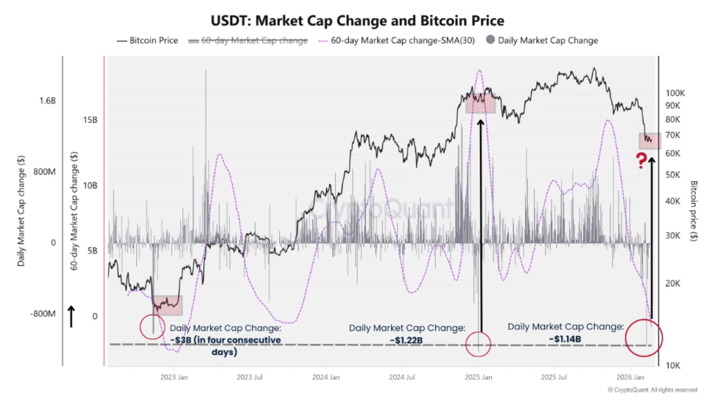 تغییر ارزش بازار ۶۰ روزه این استیبلکوین به کمتر از منفی ۳ میلیارد دلار رسیده و تاکنون تنها دو بار رخ داده است. مورد اول در اواخر سال ۲۰۲۲ اتفاق افتاد که بیت کوین در حوالی ۱۶ هزار دلار کف چرخه خود را تشکیل میداد و بیشترین ترس و فروش اجباری وجود داشت. مورد دوم اکنون در اوایل سال ۲۰۲۶ رخ میدهد که بیت کوین پس از رشد به سقف تاریخی، در حدود ۶۵ تا ۷۰ هزار دلار معامله میشود.