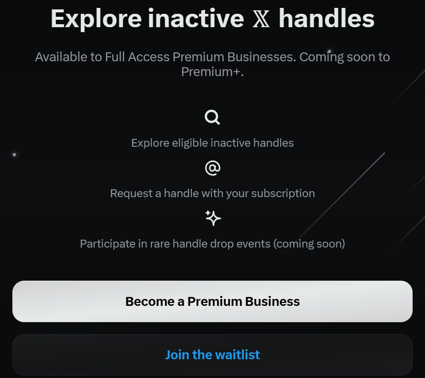 پلتفرم ایکس در حال آزمایش نسخه بتای بازار نامهای کاربری است که کاربران پریمیوم میتوانند در آن برای شرکت در رویدادهای عرضه نامهای آزاد، در لیست انتظار قرار گیرند، از طریق اشتراک پریمیوم خود درخواست نامهای خاص بدهند و یا در حسابهای غیرفعال واجد شرایط جستوجو کنند.