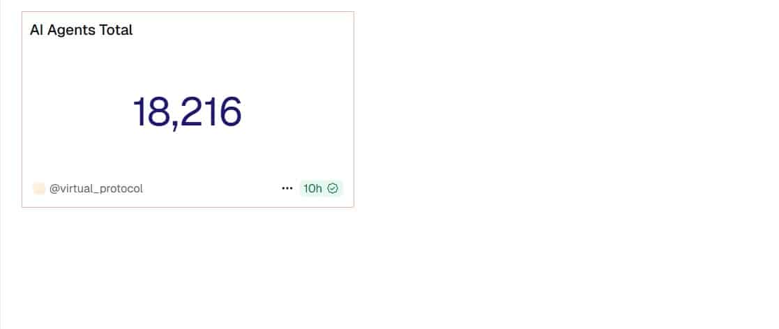 پس از اجرای این ادغام، دادههای پلتفرم Dune نشان میدهد شمار ایجنتهای هوش مصنوعی فعال به بیش از ۱۸,۰۰۰ مورد رسیده است. همچنین تعداد کیف پولهایی که بیش از ۱۰ دلار توکن ایجنت (Agent Token) در اختیار دارند، جهشی چشمگیر را تجربه کردهاند.