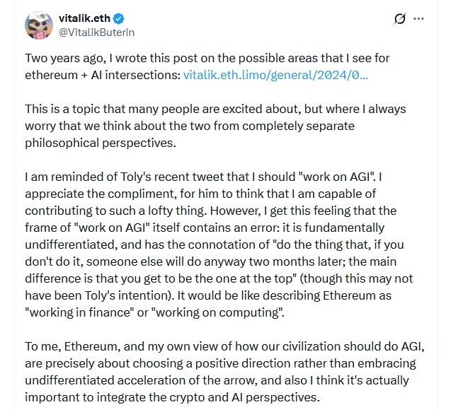 به گزارش میهن بلاکچین، بوترین در یادداشت جدید خود در شبکه اجتماعی X که در تاریخ ۲۱ بهمن ۱۴۰۴ (۱۰ فوریه ۲۰۲۶) مورد توجه قرار گرفته، تأکید کرد که هدف نهایی او توانمندسازی انسانها به وسیله هوش مصنوعی است، نه جایگزین کردن آنها. او چهار حوزه کلیدی را برای همکاری اتریوم و هوش مصنوعی معرفی کرده است: ایجاد تعاملات بدون واسطه که در آن نیازی به اعتماد به شخص ثالث نیست، تبدیل اتریوم به یک لایه اقتصادی برای همکاری رباتها با یکدیگر، استفاده از هوش مصنوعی جهت اعتبارسنجی دادههای آنچین و در نهایت، بهبود مدلهای حاکمیت و فرآیندهای تصمیمگیری در بازار.