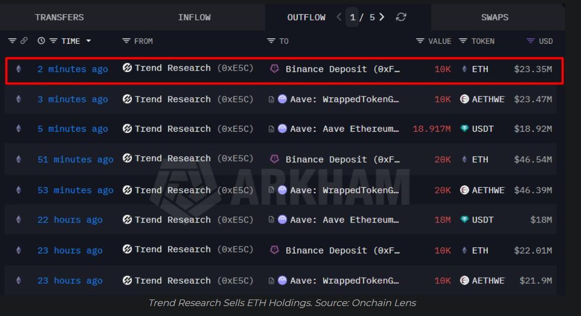 علاوه بر اقدامات بوترین، شرکت ترند ریسرچ (Trend Research) نیز با واریز ۳۰,۰۰۰ واحد اتریوم (ETH) به صرافی بایننس در تاریخ ۱۴ بهمن ۱۴۰۴، فشار عرضه در بازار را افزایش داده است. طبق دادههای آنچین، این شرکت در چند روز گذشته در مجموع ۹۳,۵۸۸ واحد اتریوم را با هدف فروش و تسویه بدهیهای مربوط به معامله با اهرم خود به فروش رسانده است.