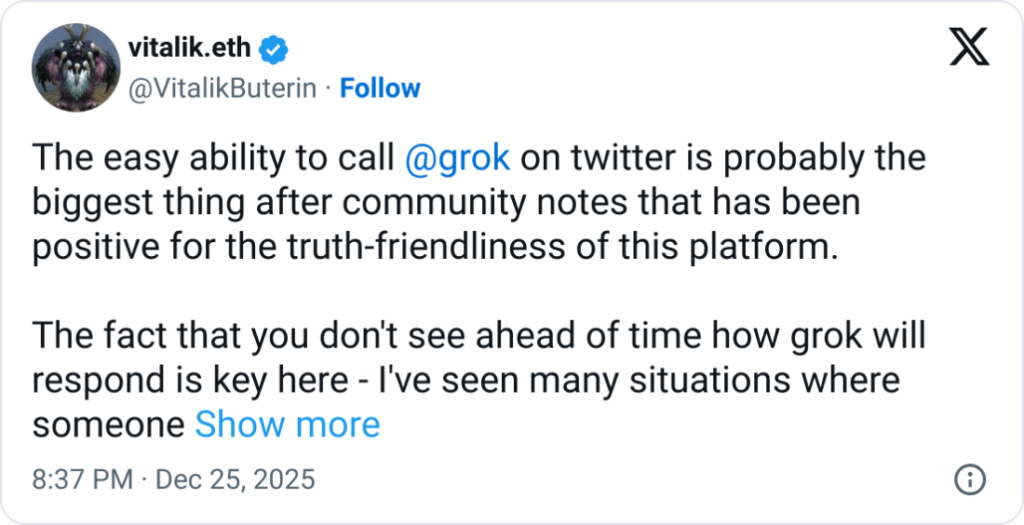 ویتالیک بوترین (Vitalik Buterin)، همبنیانگذار اتریوم، معتقد است چتبات هوش مصنوعی گروک (Grok) با همه ضعفها و حاشیههایش، در مجموع توانسته فضای شبکه اجتماعی ایکس (X) را حقیقتمحورتر کند.