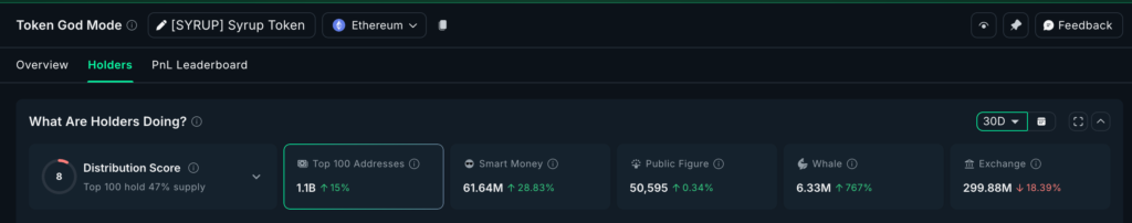 داده‌های آن‌چین هم این علاقه را تأیید می‌کنند. طی ۳۰ روز گذشته، موجودی نهنگ‌ها بیش از ۷۶۷٪ افزایش یافته و به حدود ۶.۳۳ میلیون توکن SYRUP رسیده است. مگا‌نهنگ‌ها نیز ۱۵٪ به دارایی خود افزوده‌اند و آدرس‌های سرمایه هوشمند رشدی حدود ۲۸٪ را ثبت کرده‌اند.