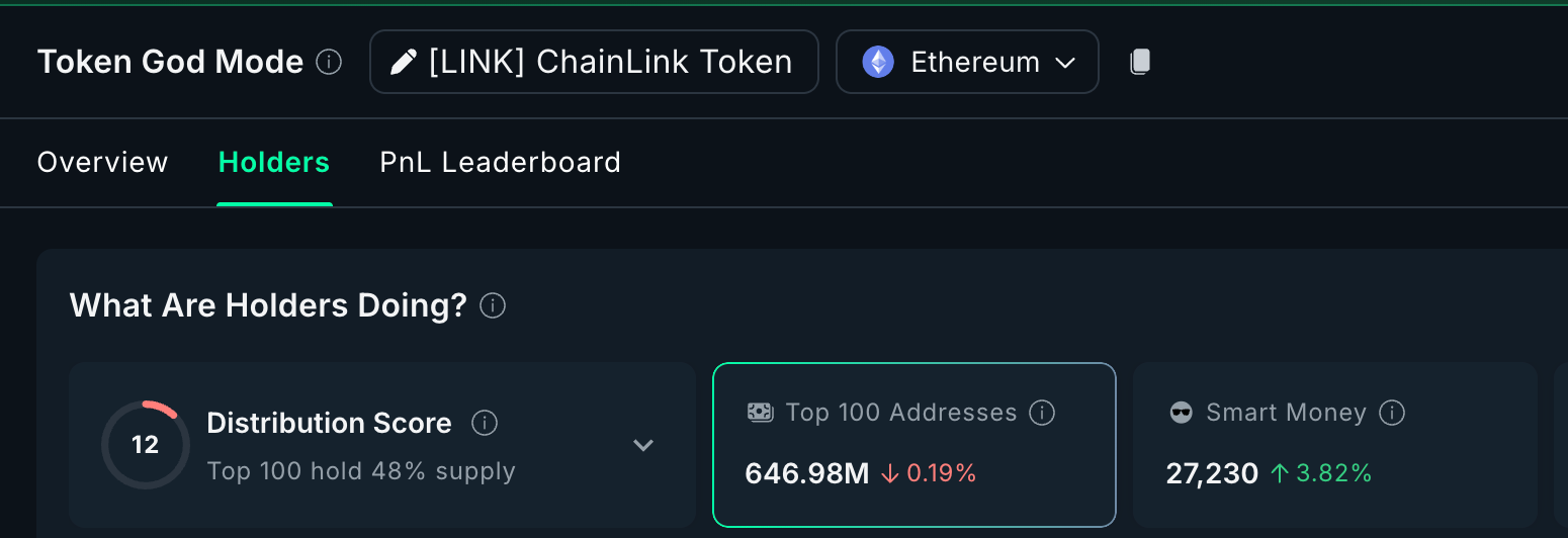 رفتار سرمایه هوشمند نیز تا حدی این دیدگاه را تأیید می‌کند. در هفت روز گذشته، آدرس‌های اسمارت‌مانی حدود ۳.۸۲٪ به موجودی LINK خود افزوده‌اند، هرچند مگا‌نهنگ‌ها بخشی از دارایی‌شان را کاهش داده‌اند. این الگو بیشتر نشان‌دهنده انباشت انتخابی است تا خوش‌بینی فراگیر، اما در شرایط ضعف بازار هم‌چنان قابل‌توجه است.