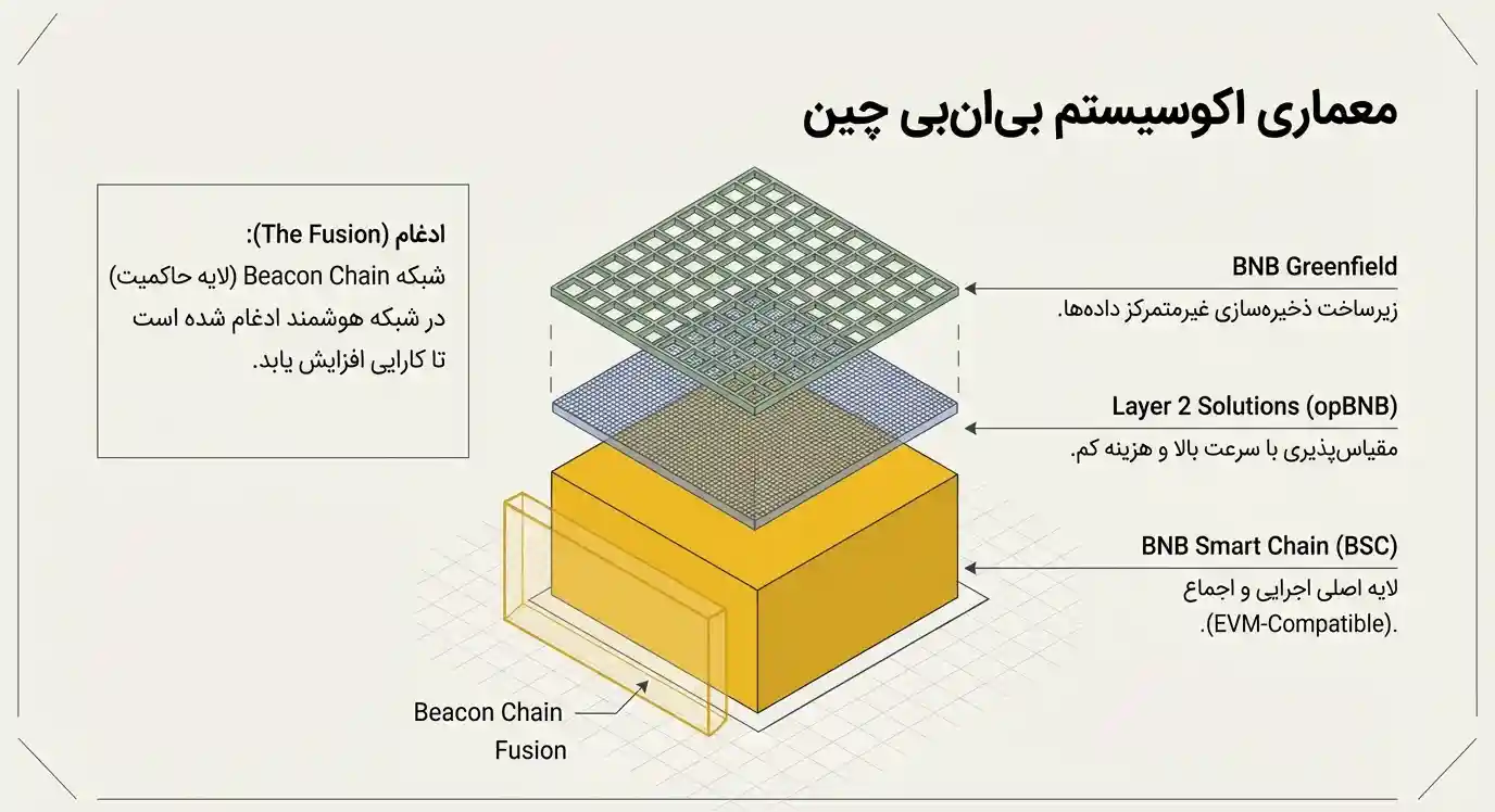 علاوه بر شبکه اسمارت چین، اکوسیستم بیانبی چین شامل راهکارهای مقیاسپذیری لایه دویی مانند opBNB (مبتنی بر رولآپهای آپتیمیستیک) و پروژههایی مانند BNB Greenfield برای ذخیرهسازی غیرمتمرکز دادههاست. این ساختار چندلایه، نشان میدهد هدف فقط ارائه یک بلاکچین پرداختی یا مبتنی دیفای نیست، بلکه ساخت یک زیرساخت کامل برای اقتصاد وب ۳ است.