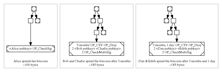 اگر ذخیره حجم ذخیره سازی هدف اصلی ما باشد، این اسکریپت را میتوان بهینهتر کرد. برای بسیاری از موانع، خرج کنندگان بیشتر تمایل به استفاده از یک شرط دارند. برای مثال، آلیس امیدوار است که مدت طولانی زندگی کند، بنابراین درخت مرکل خود را طوری میسازد تا شرط خرج کردن او همواره نزدیک به قسمت فوقانی درخت و سایر شرطها در قسمت پایین قرار داشته باشند.