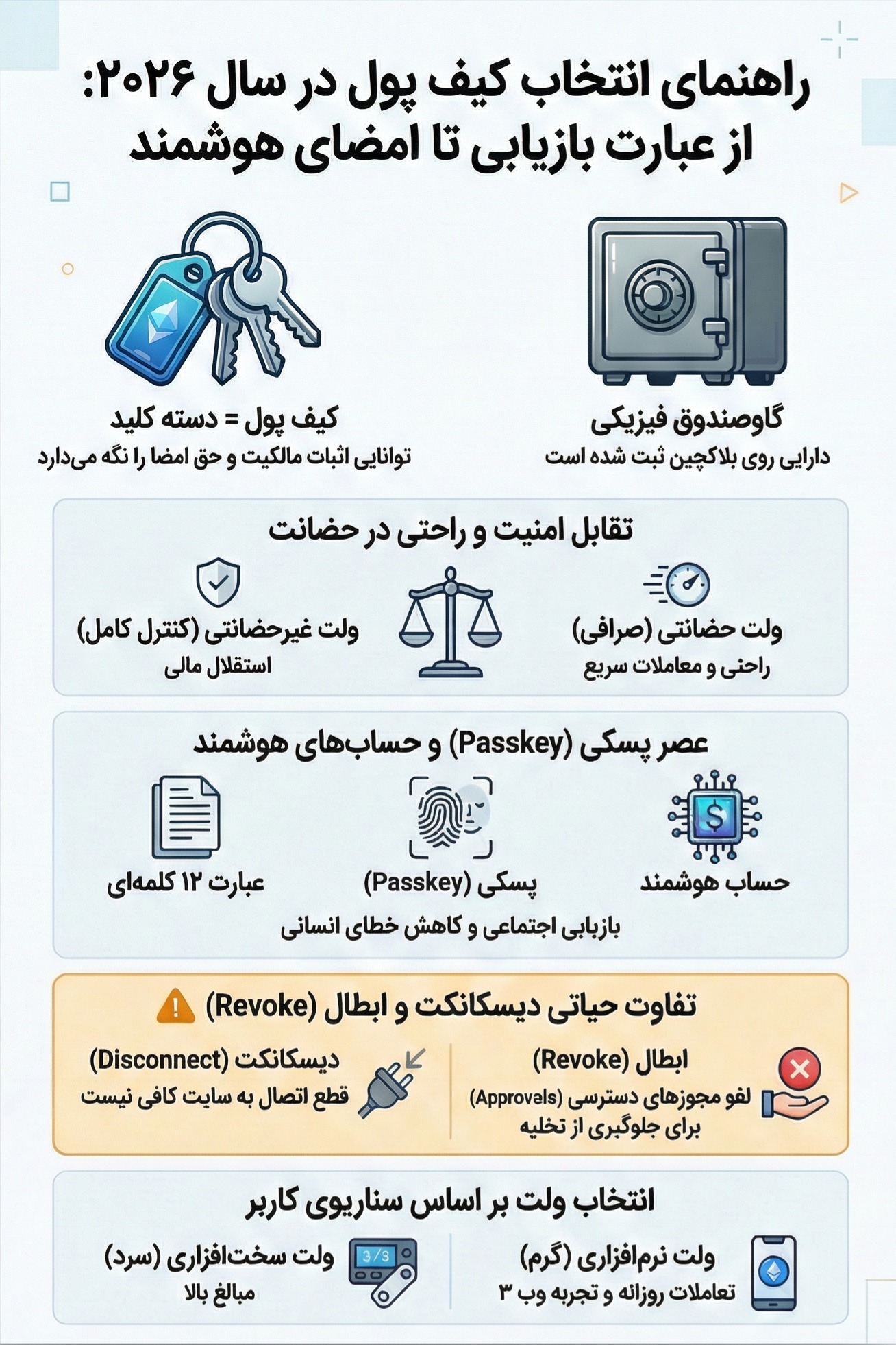 کیف پول در سال ۲۰۲۶ دیگر فقط اپلیکیشنی برای ارسال و دریافت نیست. کیف پول، نقطه تماس شما با مالکیت دیجیتال است. از یک طرف باید مفهوم قدیمی و ساده کلید خصوصی و عبارت بازیابی را درست و کامل درک کنید و از طرف دیگر باید بدانید خطرهای مدرن از کجا میآیند اگر بخواهیم تمام این مقاله را در یک تصویر جمع کنیم، کیف پول مثل یک زبان است. شما با آن به شبکه حرف میزنید. اگر زبان را بلد باشید، شبکه دقیق و شفاف پاسخ میدهد. اگر زبان را بلد نباشید، ممکن است با جملهای اشتباه، چیزی را امضا کنید که نمیخواستید. و اینجا دیگر کسی نیست که از شما بپرسد منظورت چه بوده، چرا که شبکه فقط امضا را میفهمد.