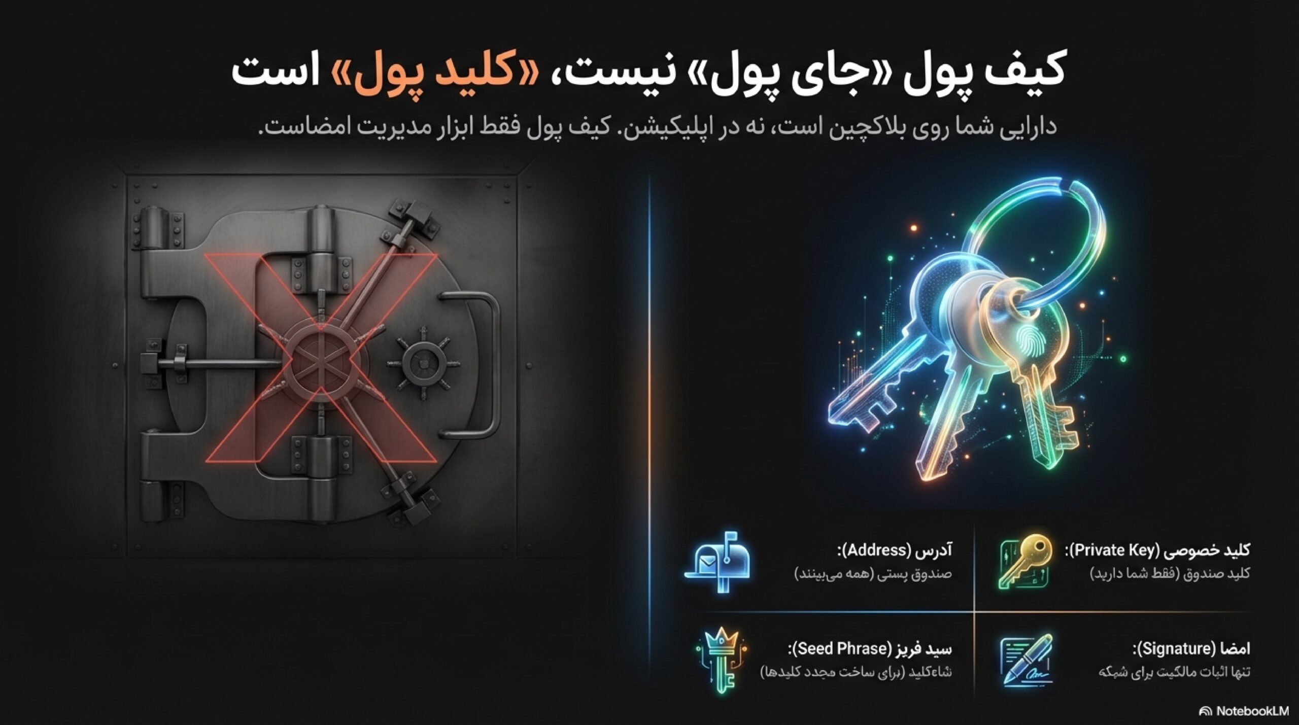 این قسمت مانند یاد گرفتن قوانین رانندگی است. قرار نیست موتور ماشین را باز کنید، اما باید بدانید پدال ترمز کدام است و چرا چراغ قرمز را نباید رد کرد. در کیف پول هم شما لازم نیست رمزنگاری را از صفر بخوانید، اما باید چهار قطعه را دقیق بشناسید تا هیچ وقت در دامهای رایج نیفتید.