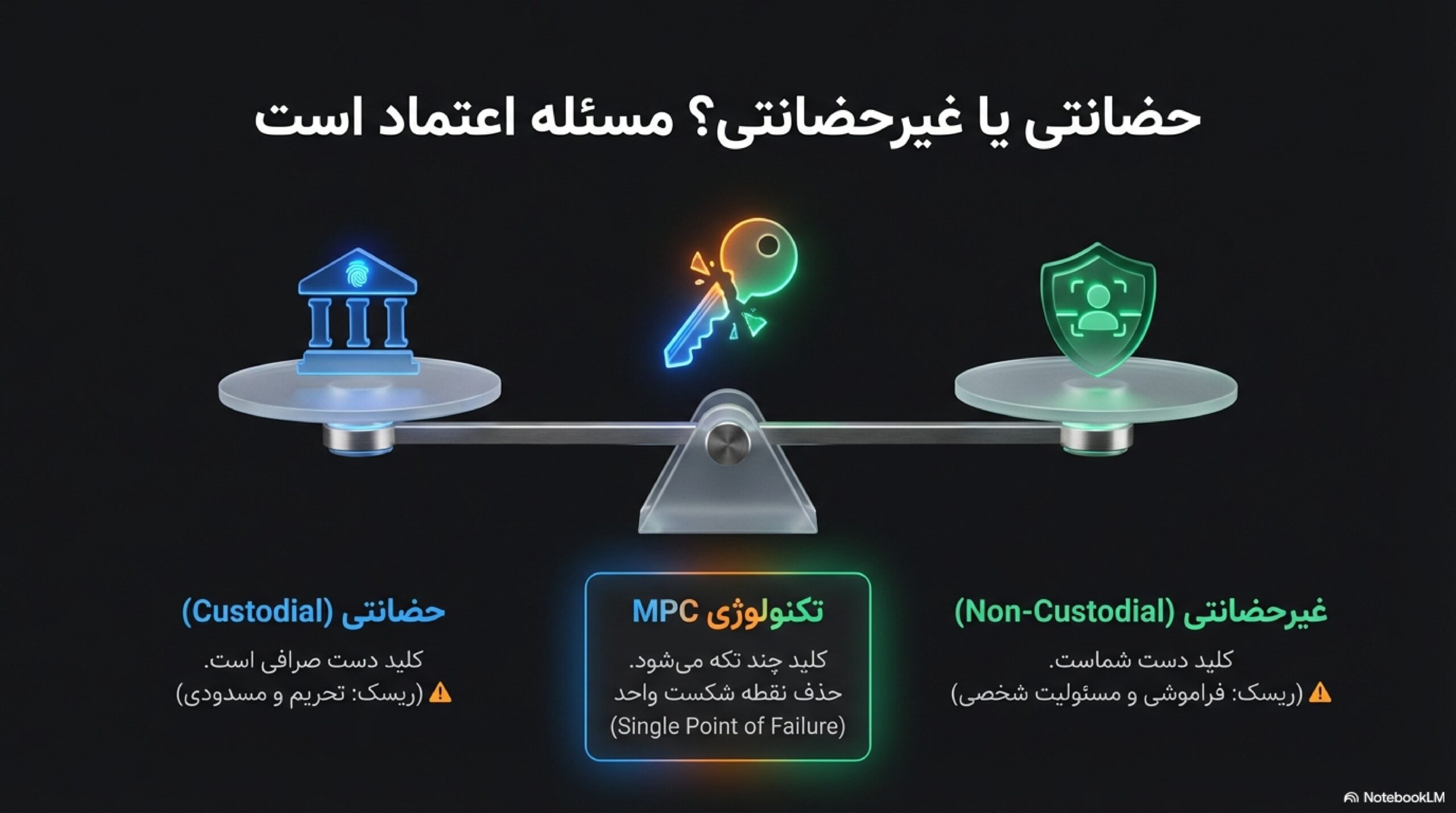 در این بخش شما تفاوت بین «راحتی» و «کنترل» را لمس میکنید. حضانتی بودن مثل این است که کلید خانهتان را به شرکتی بدهید و بگویید هر وقت خواستم در را برایم باز کن. گاهی این مدل برای شروع یا برای معاملهگری کوتاه مدت کاربردی (برای مثال داخل صرافی) است، اما اگر همه زندگیتان را پشت همان در گذاشته باشید، ریسکتان بالا میرود. غیرحضانتی بودن یعنی خودتان کلید را دارید و همین استقلال، هم نعمت است هم مسئولیت.