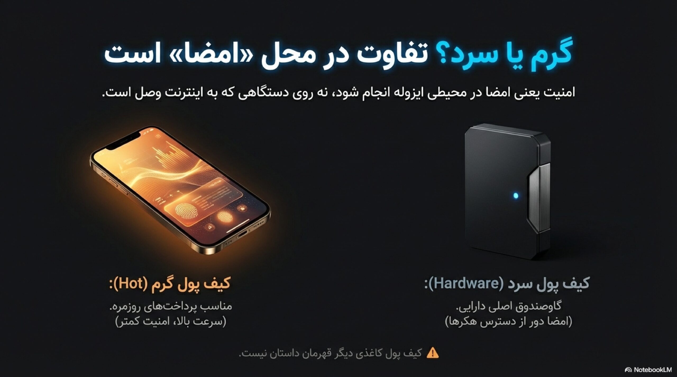 تفاوت اصلی در محیط نگهداری و امضا است. سرد یعنی کلید در محیط ایزوله و جدا امضا میکند، گرم یعنی کلید در محیط عمومی مثل موبایل یا مرورگر درگیر است.