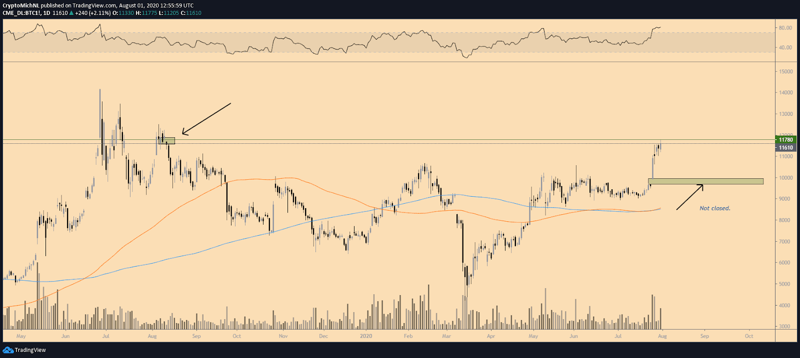 نمودار بالا، نمودار قیمت بیت کوین در CME است. همانطور که در نمودار مشخص شده است، در محدوده ۱۱۷۰۰ دلار در نمودار بیت کوین در معاملات آتی، در تاریخ آگوست ۲۰۱۹ گپ قیمتی ایجاد شده است که در رشد اخیر قیمت بیت کوین این گپ قیمتی پر شده است. در نمودار بالا گپ قیمتی دیگری در محدوده ۹۷۰۰-۱۰۰۰۰ دلار وجود دارد که قیمت هنوز این Gap را پر نکرده است. به نظر میرسد با توجه به رشد زیادی که در قیمت ایجاد شده، بازار در محدوده اشباع خرید بوده و نیازمند یک اصلاح قیمتی است. ممکن است این اصلاح قیمتی در قالب پر کردن این گپ ایجاد شده صورت بگیرد.