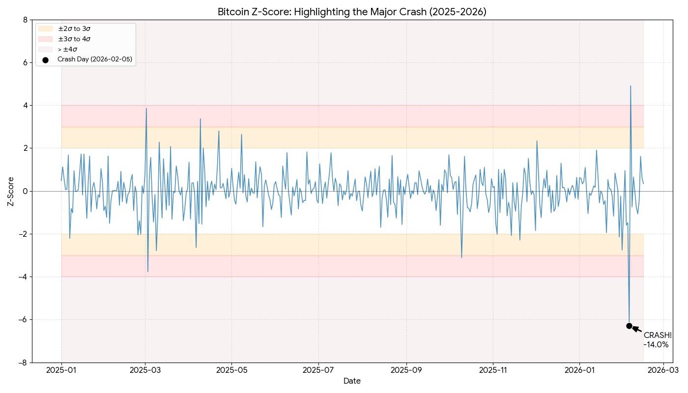 سقوط اخیر تنها یک کاهش قیمت ساده نبود؛ این حرکت با ۹ میلیارد دلار نقدینگی (Liquidation) و کاهش ۵۵ درصدی در سود باز (Open Interest) همراه شد. از منظر آماری، بیت کوین یک حرکت ۶.۰۵σ- (انحراف معیار منفی) را در شاخص Z-Score ثبت کرد که در زمره ۱۵ سقوط سریع تاریخ این دارایی قرار میگیرد.