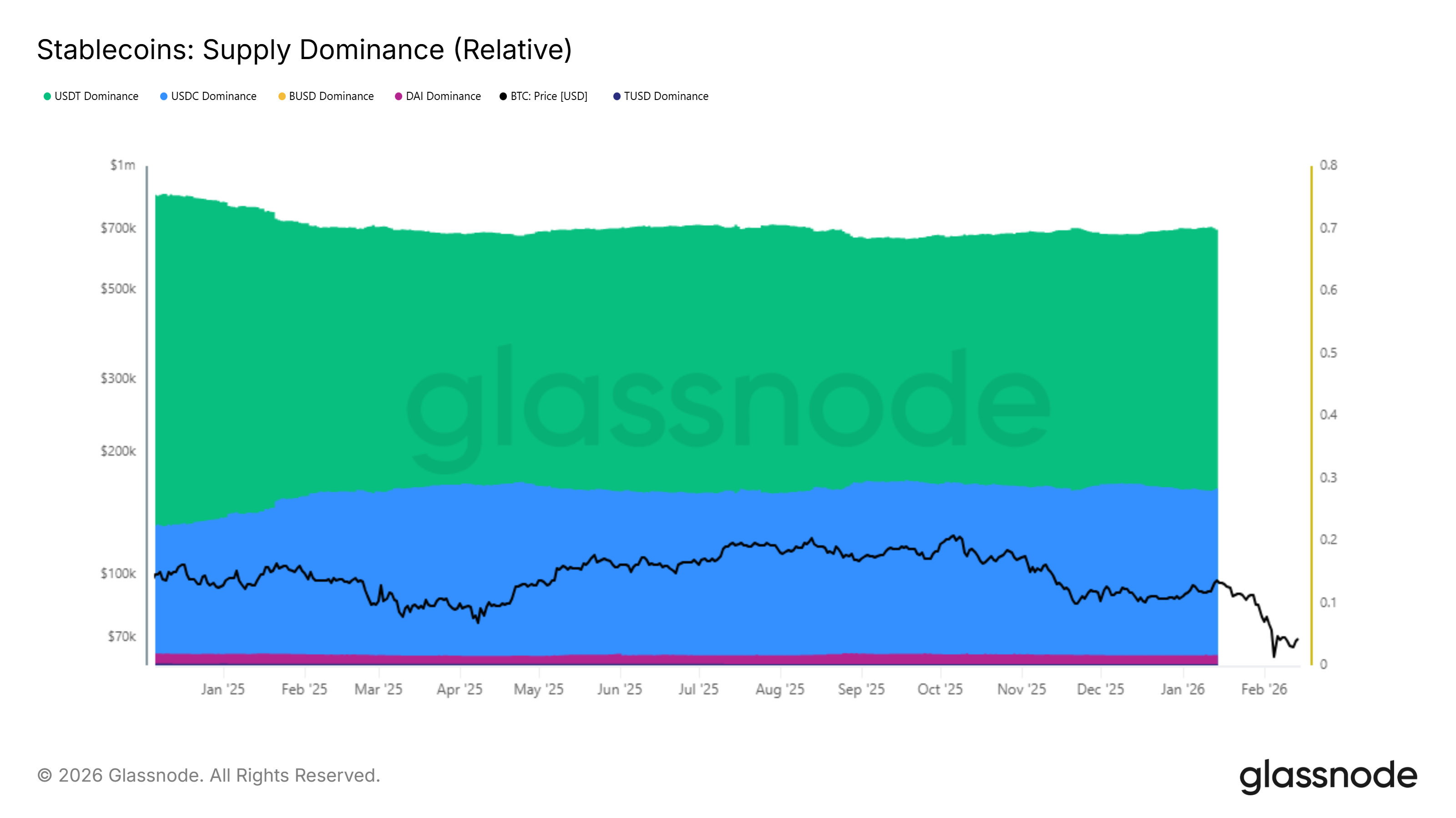 دامیننس استیبلکوینها به ۱۰.۳٪ رسیده است که از زمان فروپاشی FTX مشاهده نشده بود. در سه هفته اخیر، ۲۲ میلیارد دلار نقدینگی خالص به سمت استیبلکوینها سرازیر شده است.