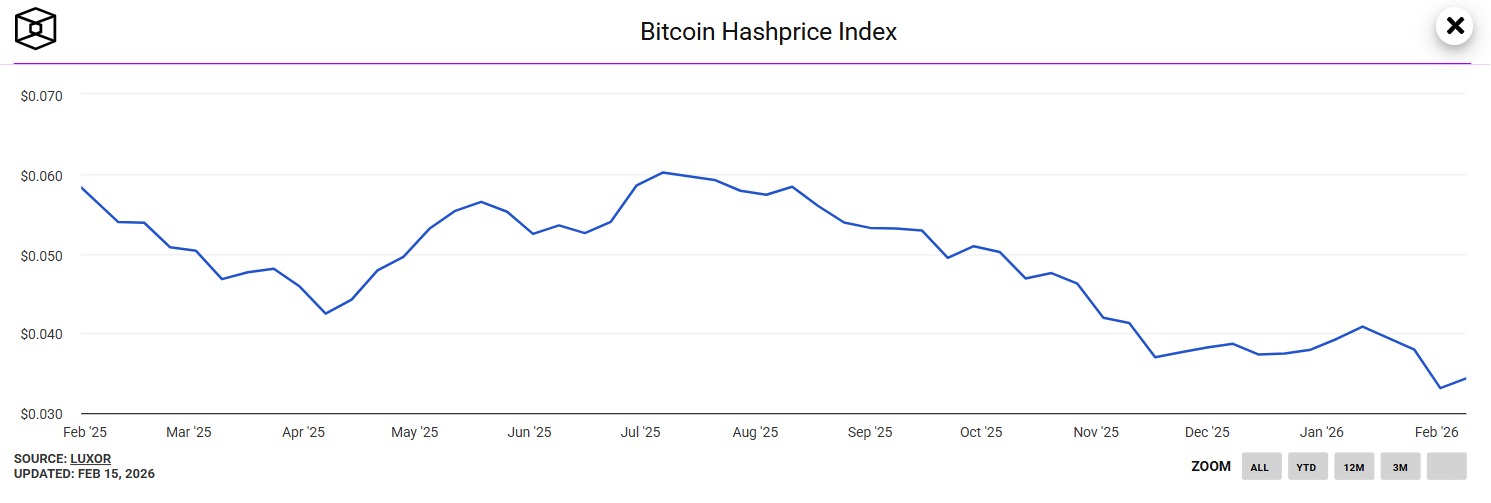فشار اقتصادی بر استخراجکنندگان به مرحله بحرانی رسیده است. شاخص Hashprice به رقم تاریخی ۰.۰۳۴ دلار به ازای هر تراهش کاهش یافته که ۳۵٪ کمتر از سال گذشته است.