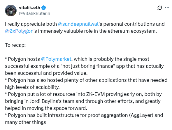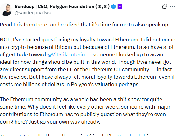 در اتهامی بزرگ، مدیرعامل پالیگان تاکید کرد که «خودیها» در جامعه ETH حتی Polygon PoS را به عنوان بخشی از اکوسیستم لایه ۲ اتریوم به رسمیت نمیشناسند، در حالی که پروژههای مبتنی بر پالیگان مانند Polymarket، به عنوان موفقیتهای اتریوم جشن گرفته میشوند.