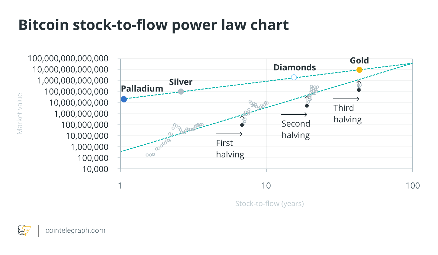 در این خصوص، PlanB فرضیه‌ای را مطرح کرده است که بیت کوین که بسیاری از افراد، آن را طلای دیجیتال می‌خوانند، می‌تواند از رابطه بین مقدار موجودی در گردش و مقدار بیت کوین استخراج‌شده در هر سال پیروی کند. وی نمودار دکارتی را ارائه داده است که در آن، رشد قیمت بیت کوین از رشد خط رگرسیون پیروی می‌کند.