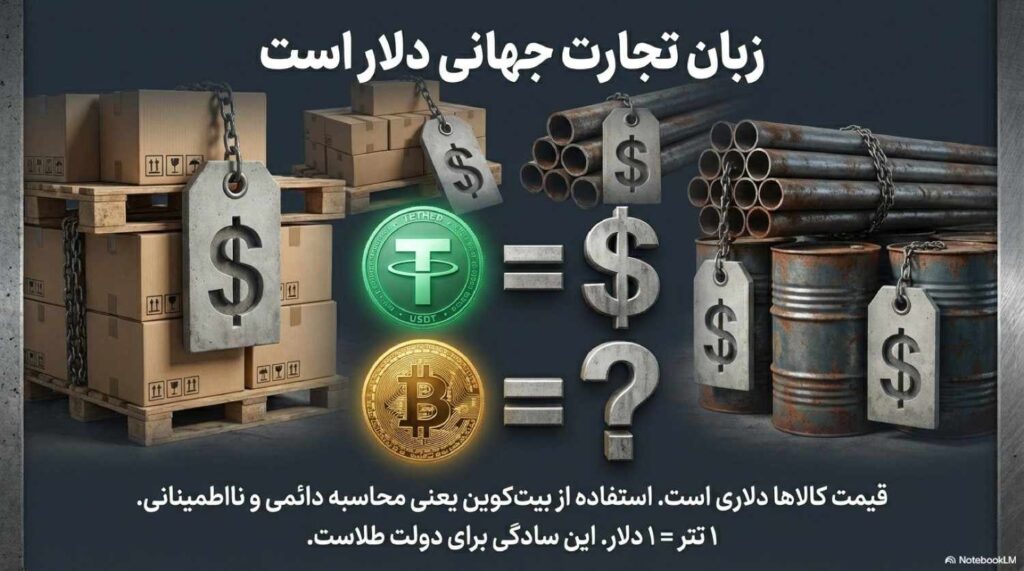 زمانی که ایران می‌خواهد گندم، دارو یا تجهیزات صنعتی بخرد، طرف مقابل قیمت را دلاری اعلام می‌کند. نه بیت کوینی، نه اتریومی. هیچ واردکننده‌ای نمی‌گوید قیمت این محموله مثلاً نیم بیت کوین است. می‌گوید پنج میلیون دلار. اگر هم کریپتو قبول کند، معمولاً می‌گوید معادل تترش را بده. تتر برای دولت‌ها کریپتو نیست. تتر دلار دیجیتال است. اگر ذخیره اصلی شما بیت کوین باشد، باید مدام ارزش آن را به دلار ترجمه کنید. هر قرارداد، هر فاکتور، هر پرداخت. این یعنی نااطمینانی دائمی. تتر این مشکل را ندارد. یک تتر یعنی یک دلار. همین سادگی، برای دولت‌ها طلاست.