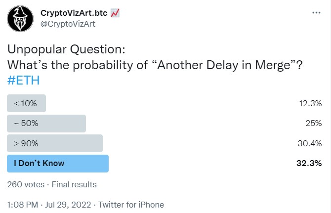 اما به هر حال این اولین بار بود که پس از چند سال انتظار برای بهروزرسانی مرج و انتقال کامل از اثبات کار (PoW) به اثبات سهام (PoS)، این بهروزرسانی یک روز مشخص (هر چند تقریبی) پیدا میکرد. بازار به این تحول مثبت واکنش بسیار خوبی نشان داد، به نحوی که قیمت ETH طی ماه گذشته حدود ۶۲.۴٪ افزایش یافت و وضعیت کل بازار رمزارز و خصوصا رمزارزهای اکوسیستم اتریوم مانند توکن آپتیمیزم (OP)، توکن پالیگان (MATIC)، توکن لیدو (LDO) و رمزارز اتریوم کلاسیک (ETC) بهبود قابل توجهی یافت. با این حال، با نزدیکتر شدن تاریخ وعده دادهشده برای مرج و فروکش کردن هیجانات، واقعیت ماجرا که تاکید سوپرفیز بر تقریبی بودن تاریخ اعلام شده است، رفته رفته پررنگتر میشود. این موضوع را میتوان به وضوح در شبکههای اجتماعی دید. برای مثال کریپتوویزارت (CryptoVisArt) تحلیلگر معروف ایرانی شرکت تحلیل داده آنچین Glassnode، در توییتر نظرسنجی زیر را به اشتراک گذاشت: