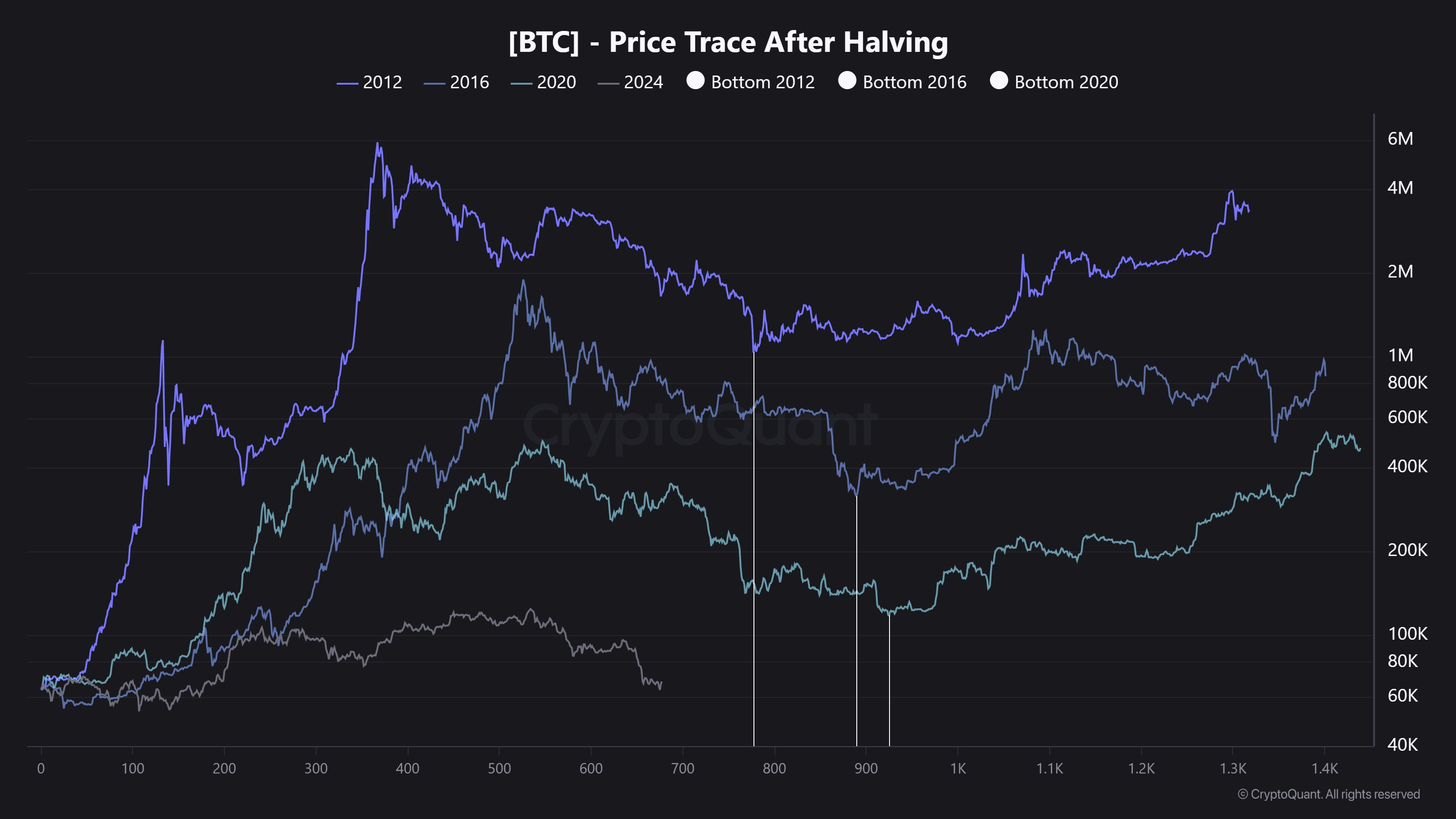 شرکت تحلیل آنچین CryptoQuant با استفاده از داده‌های تاریخی سه رویداد هاوینگ قبلی بیت کوین در سال‌های ۲۰۱۲، ۲۰۱۶ و ۲۰۲۰ تلاش کرده است زمان احتمالی بازگشت قیمت پس از هاوینگ آوریل ۲۰۲۴ را مشخص کند.