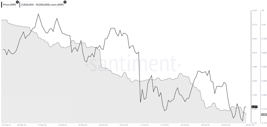 در همین حال، دادههای منتشرشده توسط شرکت سنتیمنت (Santiment) نشان میدهد نهنگهایی که بین ۱ تا ۱۰ میلیون واحد XRP در اختیار دارند، تنها در ۴۸ ساعت گذشته بیش از ۵۰۰ هزار توکن را به فروش رساندهاند و میزان دارایی این گروه از نهنگها از حدود ۷ میلیارد توکن در اوایل سپتامبر به ۶.۲۳ میلیارد واحد کاهش یافته است.