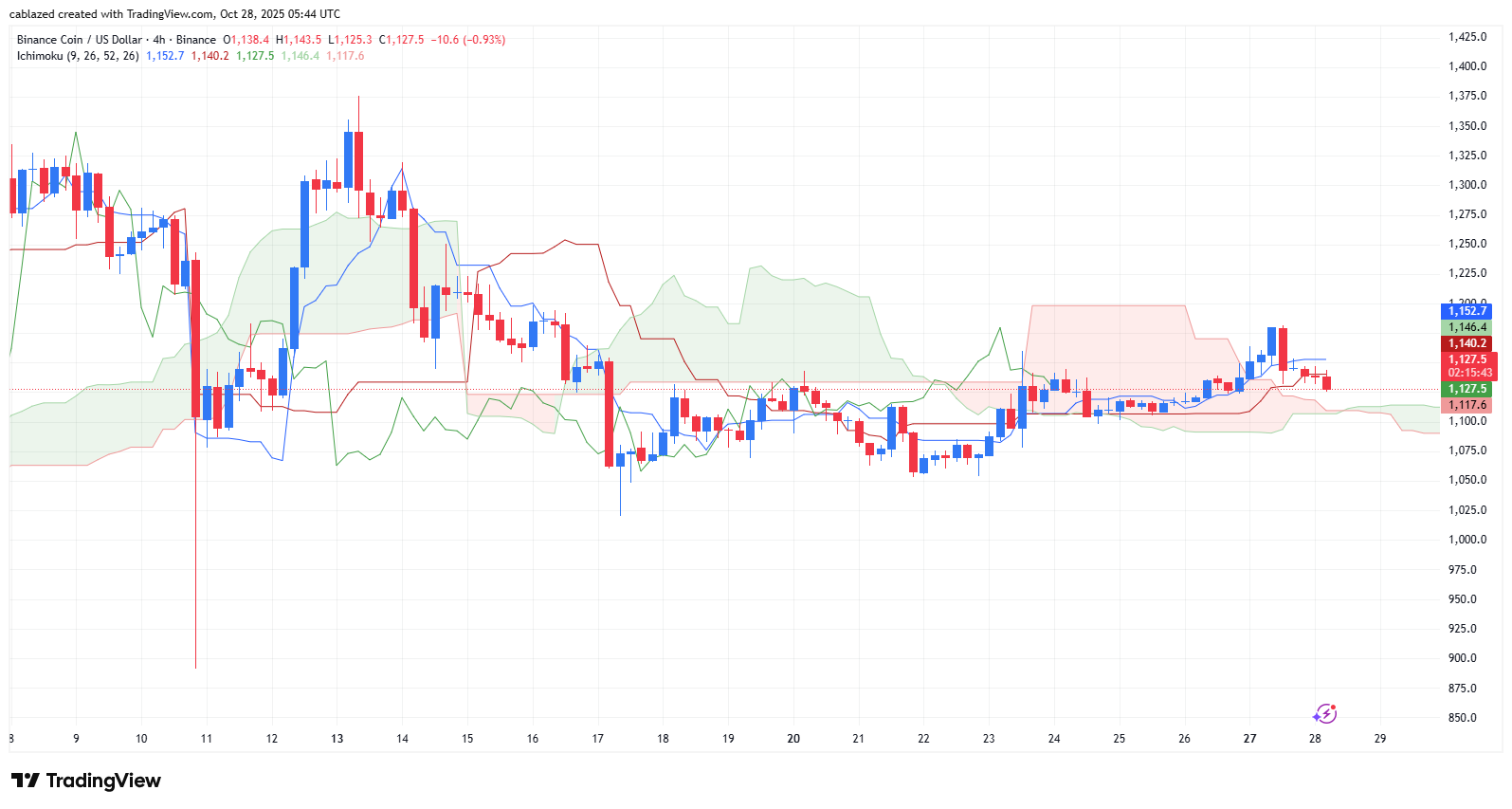 در نمودار چهار ساعته BNB/USD، شاهد یک روند صعودی هستیم. قیمت بی ان بی در حال حاضر ۱,۱۲۷.۵ دلار است و به طور واضح در بالای ابر کومو (Kumo) معامله میشود که این خود یک سیگنال قوی صعودی (Bullish) محسوب میشود. ابر آینده (Future Kumo) نیز سبز رنگ است و رو به بالا تمایل دارد که نشاندهنده ادامه تمایلات صعودی در میانمدت است. خط چینکو اسپن (Chikou Span) یا همان خط سبز، در بالای نمودار قیمت در ۲۶ دوره قبل قرار دارد که این موضوع نیز تأیید کننده قدرت روند صعودی فعلی است.