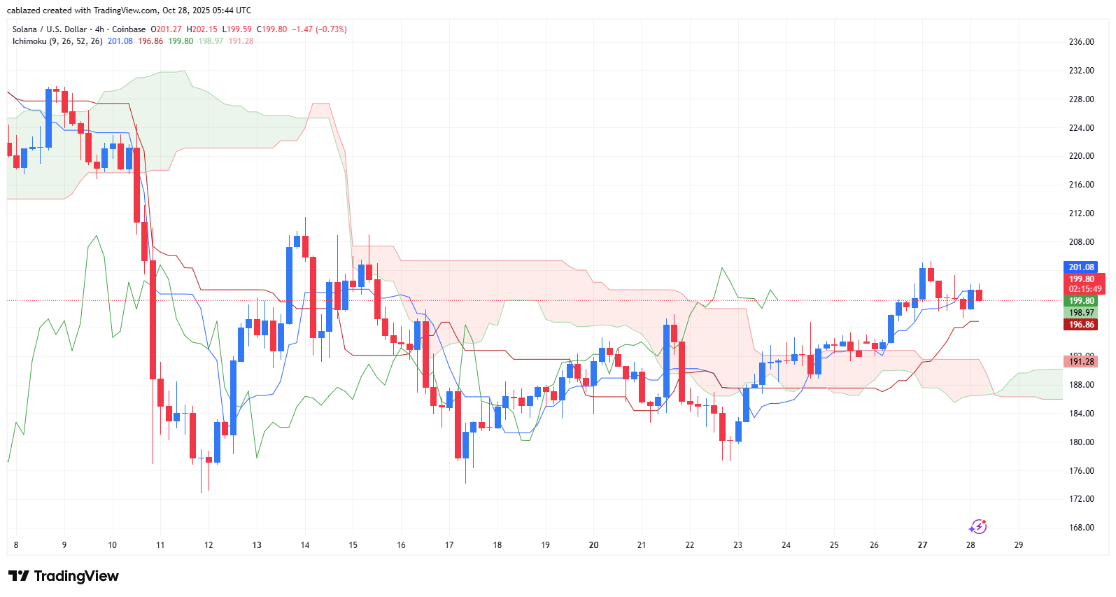 نمودار SOL/USD نشاندهنده یک تغییر روند احتمالی از خنثی/نزولی به صعودی است. قیمت سولانا در حال حاضر ۱۹۹.۸۰ دلار است و اخیراً موفق به شکستن ابر کومو به سمت بالا شده است (Kumo Breakout). این یک سیگنال صعودی بسیار مهم در سیستم ایچیموکو است. علاوه بر این، خط چینکو اسپن (خط سبز) نیز از بالای نمودار قیمت عبور کرده که این شکست را تأیید میکند. ابر کوموی آینده نیز در حال تغییر رنگ از قرمز به سبز است که نشاندهنده آغاز یک روند صعودی جدید میباشد.