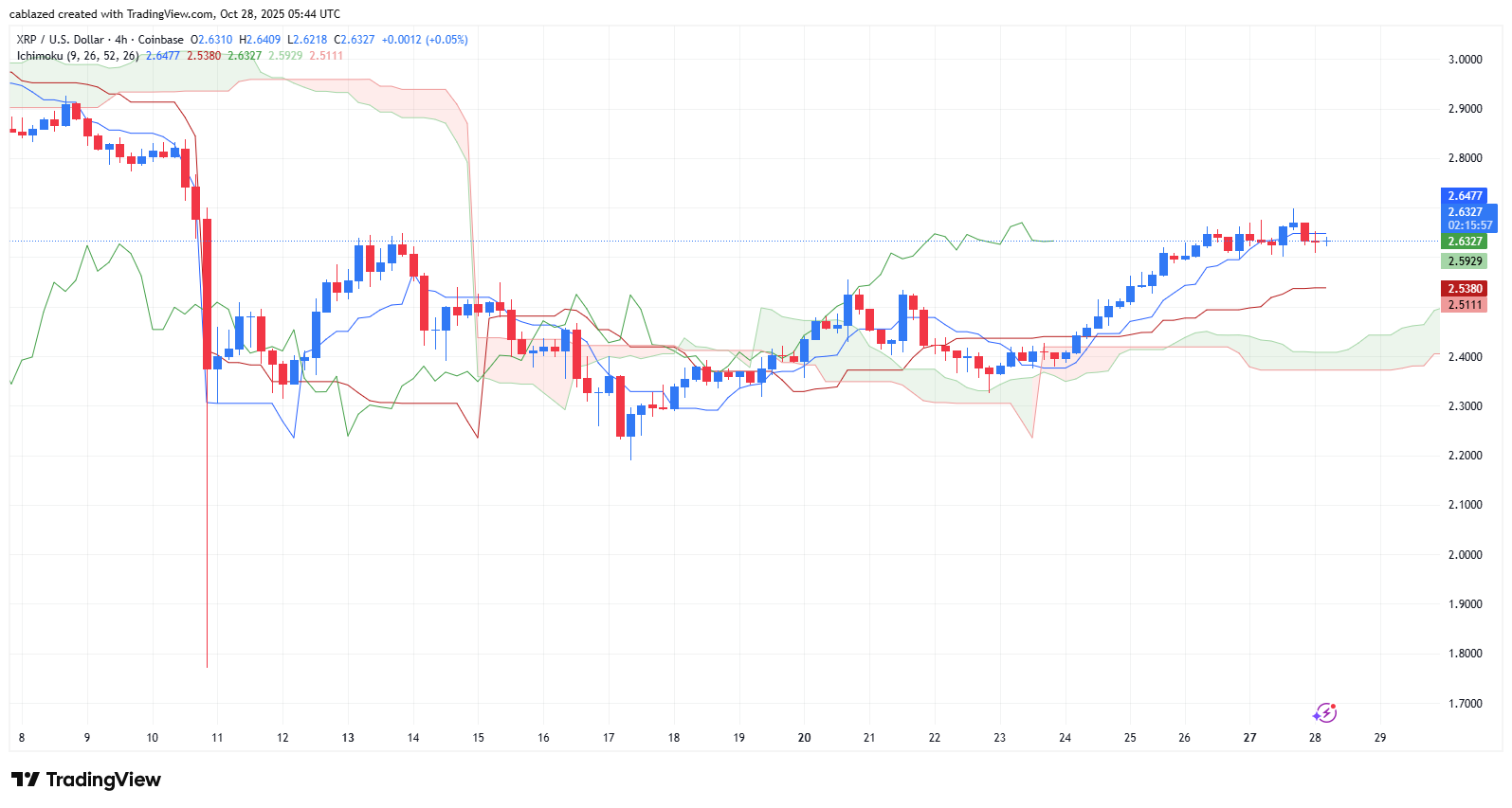 نمودار XRP/USD یک روند صعودی بسیار قوی و تثبیت شده را نشان میدهد. قیمت ریپل در حال حاضر ۲.۶۳۲۷ دلار است و با فاصله قابل توجهی در بالای ابر کومو قرار گرفته است. ابر کوموی آینده ضخیم و سبز رنگ است که نشاندهنده یک منطقه حمایتی بسیار مستحکم و ادامه قدرتمند روند صعودی است. خط چینکو اسپن (خط سبز) نیز کاملاً آزاد و در بالای قیمتهای گذشته قرار دارد که این خود تأیید دیگری بر قدرت این روند است.