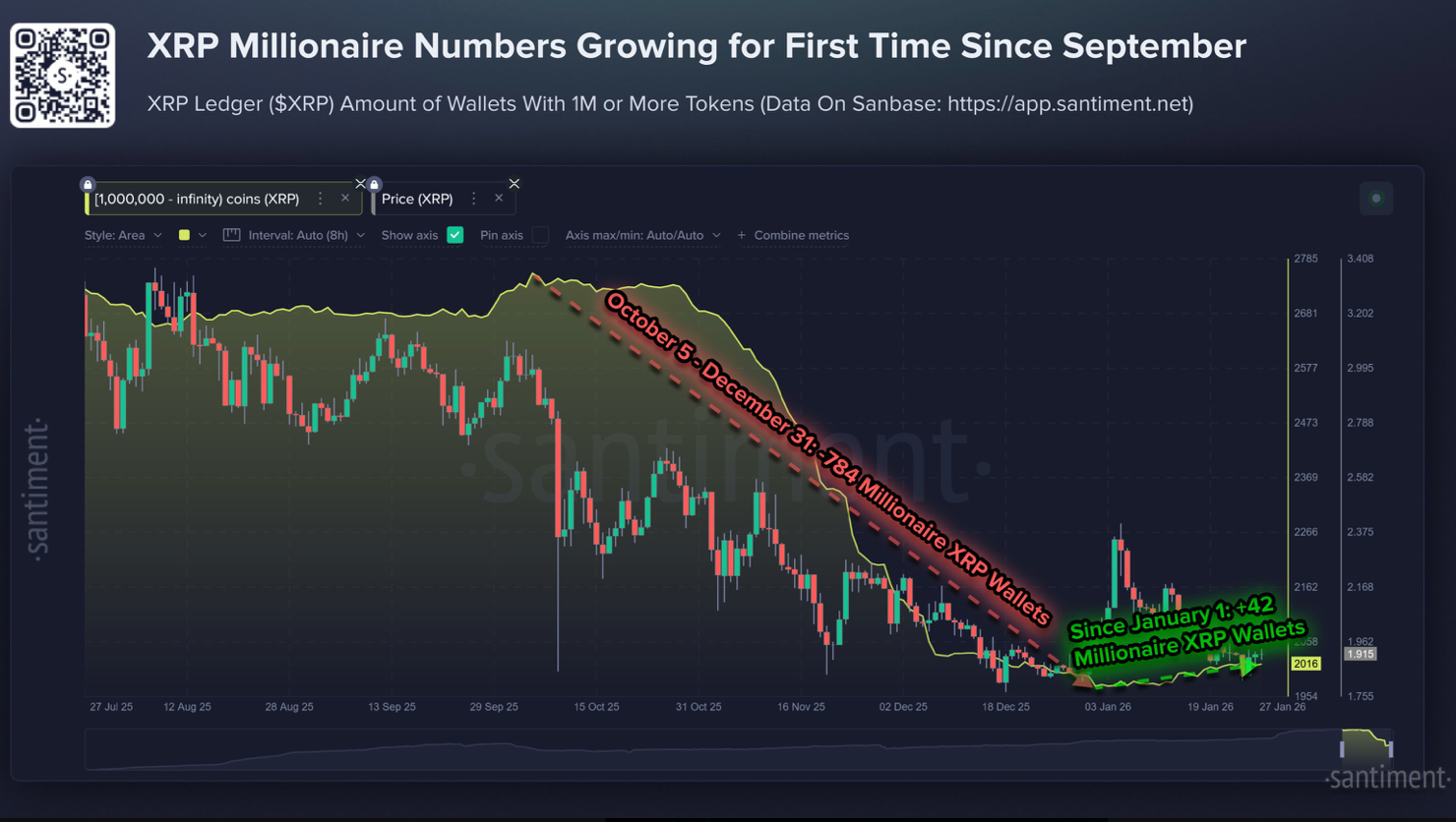سنتیمنت در گزارش خود توضیح داده است که هرچند قیمت ریپل از ابتدای سال ۲۰۲۶ با افت اندک ۴ درصدی روبرو شده، اما تعداد «کیف پولهای میلیون دلاری» آن برای اولین بار در چند ماه اخیر دوباره رو به افزایش گذاشته است.