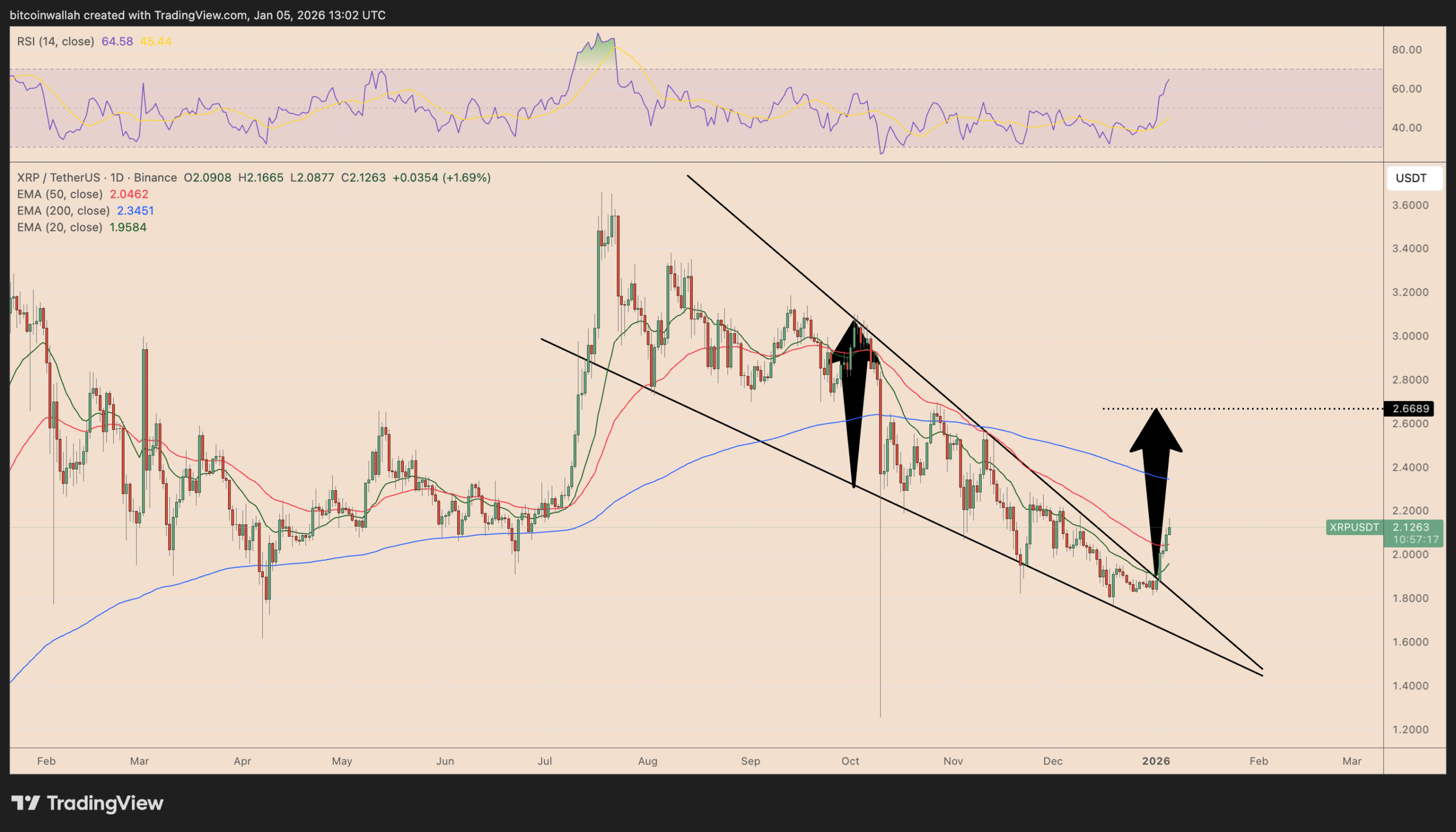 در روزهای ابتدایی ژانویه، ریپل موفق شد بالای خط روند بالایی این الگو و در محدوده ۲.۰۵ تا ۲.۱۰ دلار تثبیت شود؛ حرکتی که با بهبود شاخص قدرت نسبی نیز همراه بود و اعتبار شکست را افزایش داد.