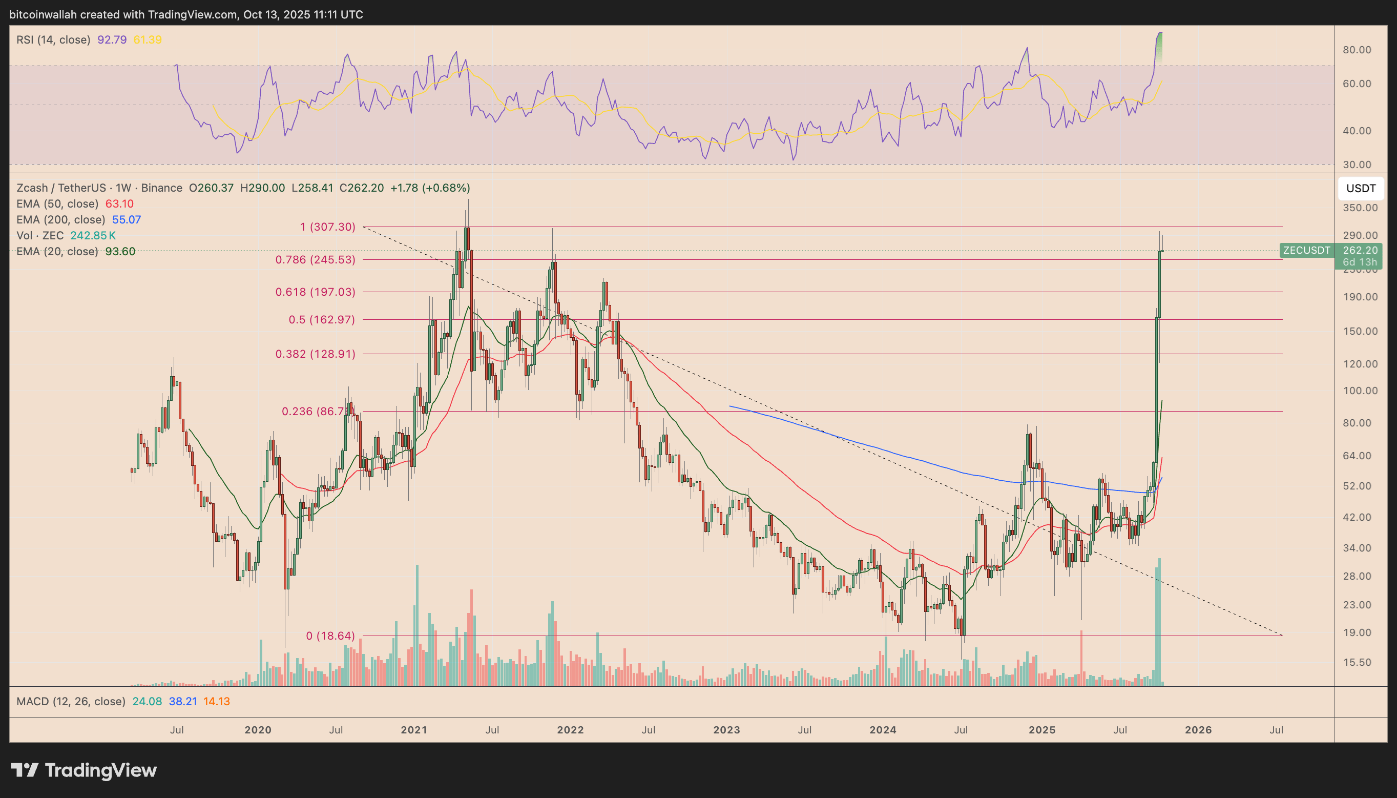 در روزهایی که بسیاری از ارزهای دیجیتال زیر فشار فروش قرار گرفتهاند، زیکش برخلاف جریان بازار حرکت کرده و با جهشی بیش از ۵۲۰ درصدی در یک ماه گذشته، توجه همه را به خود جلب کرده است. در حالی که در آخر هفته گذشته بیش از ۲۰ میلیارد دلار از پوزیشنهای اهرمی در بازار لیکوئید شد، زیکش توانست خود را به نزدیکی محدودهی ۳۰۰ دلار برساند؛ سطح قیمتی که از دسامبر ۲۰۲۱ تاکنون دیده نشده بود.
